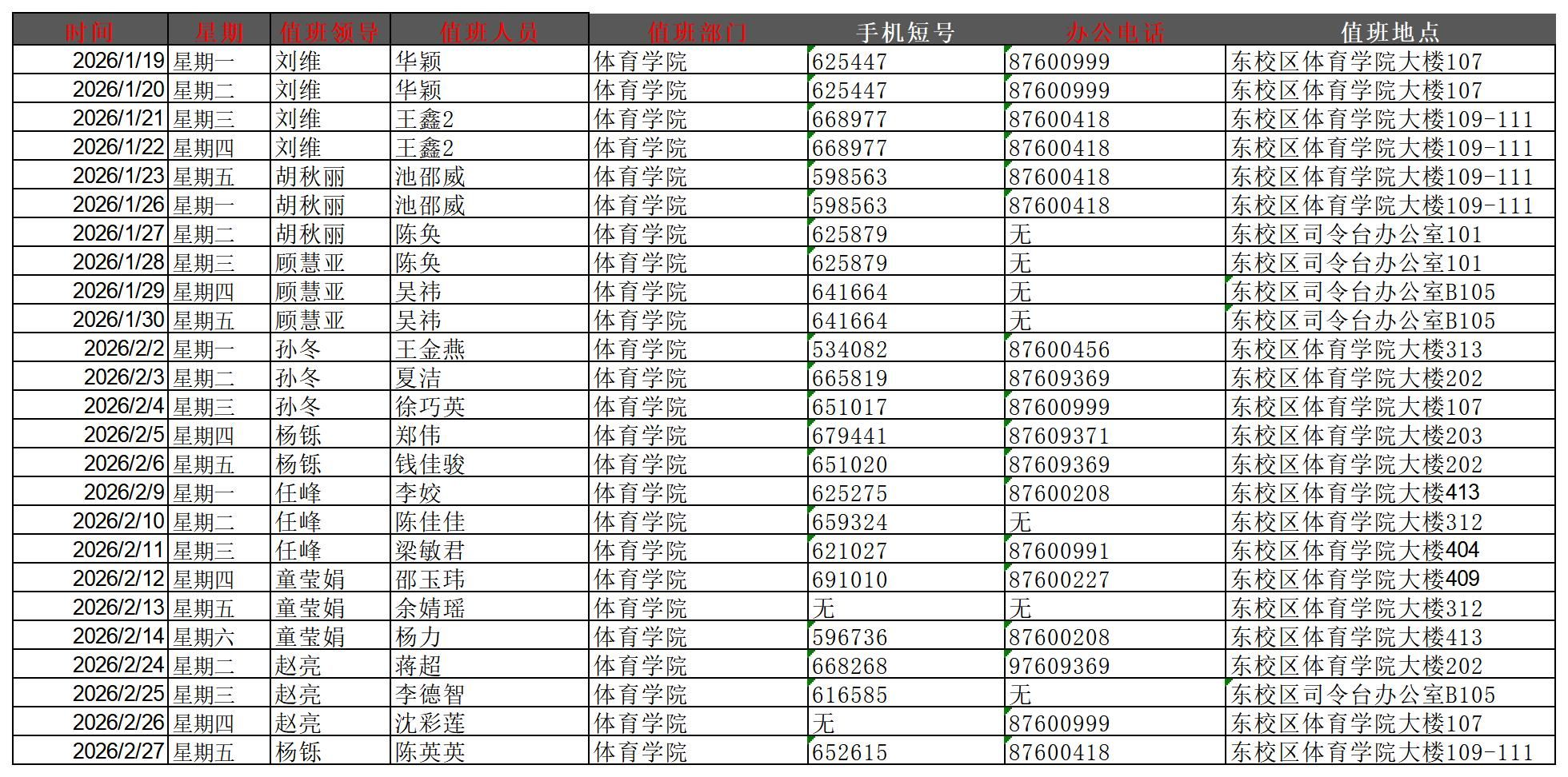 2026年电竞博彩 寒假轮休值班表